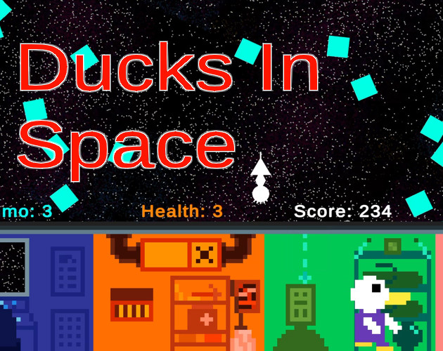 In DUCKS IN SPACE, you play as an astronaut duck, avoiding and destroying the blue asteroids, while keeping your spaceship afloat.